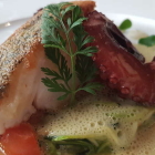 Der als erste Vorspeise servierte Steinpilzsalat war eine delikate Komposition aus in dünne Scheiben geschnittenen Steinpilzen, golden angebraten, lauwarm angerichtet auf einem Bett aus verschiedenen Blattsalaten und mit einem unaufdringlichen nicht das Pilzaroma überdeckendem feinen Dressing aus Alpkäse überzogen, ergänzt von hauchdünn geschnittenem mildaromatischen von krossem Schinkencrumble bekrönten hauchdünn gehobelten Käsestreifen, garniert mit Kerbel und Majoranblüten - ein toller Auftakt, der neugierig stimmte.