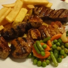 waren vom Schwein. Das Fleisch sehr mager, aber keinesfalls trocken. Ganz im Gegenteil, der Anschnitt saftig. Verstärkend dazu die Füllung mit dem sehr guten Schafskäse. Die beiden Steaktaschen werden mit einer sehr gut schmeckenden Metaxasauce serviert, dazu ebenfalls gut gebräunte Wellenpommes und das Gemüse.