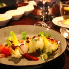 und würzig-süßlich, eben mit typischem Blutgeschmack. Klar, dass dazu ein kräftiges Fleisch wie der Hirsch gepasst hätte. War ja nicht. Stephan Mießner löste dies Dilemma mustergültig: Das kurz gebratene südafrikanische Springbockfleisch, das ich so ähnlich schon einmal in London probieren durfte, war zart und fest zugleich, hatte geschmacklich Ähnlichkeit mit Reh, aber doch eine "wildere" Note.  Allerlei bunte Begleitung umtanzte die gewichtigen Hauptdarsteller.