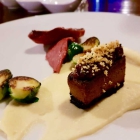 Die wahrlich von anderem Kaliber war. Eine Terrine von der Taubenleber auf dunkler Brioche, mit einer Fruchtschicht (Portweinfeige oder -pflaume?) und Käsecrumble war würzig und fein zugleich und hatte mit dem ausgestrichenen Mus der süßlichen Petersilienwurzel eine tolle Ergänzung. Irritierend dagegen der nur leicht angebratene reichlich vorhandene Rosenkohl. Nicht sonderlich passend und in der Zubereitung für mich zwischen lustlos und plump angesiedelt.