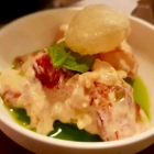 Ein gebackener panierter Würfel von Ragout fin vom Perlhuhn mit einer cremigen Hollandaise, crunchigen Zuckererbsen und Shitake. Die Überraschung, die sich bei der Durchbrechung erwarteter Geschmackserlebnisse einstellt, lässt mich noch heute der Molekularküche hinterher trauern.