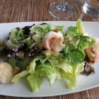 Wie gesagt alles war durchweg von sehr guter Qualität, der Fisch jeweils saftig und leicht glasig gegart, wenn auf der Hautseite gebraten diese supercross. Die Portionen sehr ordentlich, eigentlich als Menue kaum zu schaffen, für uns als gut trainierte Hochleistungsgenießer trotzdem kein Problem. Herauszuheben sind der Salat mit gebratenen und geräucherten Garnelen –eine sehr gelungene Kombination mit leicht schmeckendem Orangendressing, und das Zanderfilet mit Pfifferlingen –genial in Verbindung mit etwas Lauch sowie mildem Meerrettich-Kartoffelpüree (!). Die Pfifferlinge jeweils gut geputzt, auf den Punkt gegart und nicht sandig.
