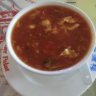 Nach nur wenigen Minuten wurde die Suppe serviert, die offensichtlich in einer Warmhaltevorrichtung bereitgehalten worden war. Diese längere Warmhaltephase war an der Konsistenz der Suppe klar erkennbar, beeinträchtigte den Geschmack der Suppe aber nicht erkennbar. Es handelte sich um die übliche Pekingsuppe, die in allen mir bekannten China-Restaurants als Vorsuppe serviert wird. Sie war nicht mehr ganz heiß, aber doch schmackhaft, mit dezenter Säure und Schärfe wie es sein soll.