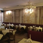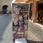 Im Inneren ist die Einrichtung modern mit hellbraunem bzw. rotem Leder bezogen und umgeben von Wandmalereien oder auf einer schönen Empore, fühlt man sich wie in einer großen Lounge. Die großen Fensterflügel zum Marktplatz waren an diesem Tag geöffnet. Genau an diesem Tisch davor durften wir Platz nehmen. Wir hatte somit eine geniale Aussicht über das komplette Treiben auf dem Marktplatz.