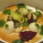 Gefüllte „Eierhüllen“ sind wohl ein Markenzeichen für das Restaurant. Jedenfalls kommen sie häufig auf die Karte, sind aber stets anders gefüllt oder gewürzt. Auch heute war es wieder ein „Knaller“. Die Käse-Mousse war herrlich geschmacksintensiv; sehr mutig gewürzt. Im Inneren fand ich etwa dreich Schichten mit verschiedenen Aromen: Unten waren keine eingemachte Feigenstücke, dann folgte eine Creme, die Senftöne zeigte und eben die Käsenoten von Nussgeschmack. Oben waren einige kleine Salatblättchen plaziert.