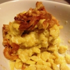 Keine zwei Cocktailtomaten später standen auch schon unsere Hauptspeisen vor uns. Bei den in einer ovalen Schale gereichten Kässpatzen wurde nicht an Röstzwiebeln gespart. Ein zugegeben nicht gerade asketisch anmutendes Gericht, dessen eidottergelbe Protagonisten unter einer geschmolzenen Allgäuer Käsemischung begraben lagen. Auch mengenmäßig einer ausgewachsenen Hauptspeisenportion durchaus würdig. Aber hallo, wir sind hier in Bayern!