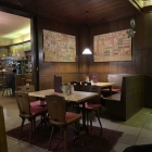 Hier gibt es zum Teil Bänke und Tische und eine komplette Holzverkleidung. An einer Ecke hängen alte Bilder , so Art Karten wie man es von früher in der Schule noch vom Erdkundeunterricht kennt, die man so aufrollen kann. Hier sind die Brauvorgänge hinterlegt. Es gibt helle Tischplatten und dunkel Stühle und Sitzkissen in rot sind auch vorhanden.