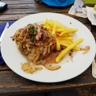 Ich hatte das Pfälzer Rumpsteak, ergänzt durch eine Rotweinsauce und Zwiebeln. Meine Frau das Rumpsteak mit Würzfleisch (auch so etwas Nostalgisches). Dazu Pommes, ein großer Teller voll. Sehr gute Fleischqualität, das Steak eine gute Flocke Fleisch, wie mein Großvater gesagt hätte.