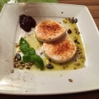 gratinierter Ziegenfrischkäse. Frau Day hatte den wie eine Creme Brulee geflämmt und Zucker darauf karamellisiert. Auf dem Teller ein (ich vermute) Traubenkernöl und ein bisschen Knack von ein paar Körnern. Leckerer Abschluss, aber nicht ohne einen weiteren Barrique Spätburgunder zu trinken.