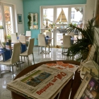 Schön luftiger Bistrocharakter mit maritimen Dekoartikeln, Schiffe, blaue Tischläufer, blaue feste Papierservietten, Wastelstreuer, auf den Tischen leider Plastikblumen. Aber durchaus gemütlich mit einer Meertapete im Hintergrund. In der ersten Etage ein kleines Restaurant für den Abendbetrieb hier mit Stofftischdecken. Draussen auf dem Kirchplatz schöne Aussenplätze mit Strandkörben.
