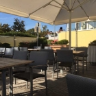 Es wurde hier auf dem Parkplatz eine Terrasse gebaut mit Holzboden und Glasabtrennung. Außen rum ist alles schön bepflanzt und begrünt. Beschattet wird der Bereich von Sonnenschirmen, die allerdings nicht alles abdecken.