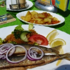 Ich entdeckte „Grüne Heringe, gebraten“ zu € 9,40. Die Beilage kann wählen. Ich entschied mich für Bratkartoffeln, diese wurden extra für mich ohne Speck zubereitet. Das ist wirklich nett!
