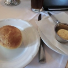 Nach einiger Zeit kam die Bedienung und brachte einen Korb mit zwei warmen Pizzabrötchen und eine Schale mit selbst gemachter Kräuterbutter. Ich schnitt ein Brötchen auf und ließ ein Stück Kräuterbutter darin schmelzen – sehr gut! Doch angesichts der noch vor mir liegenden Fahrtstrecke wollte ich mich nicht überlasten und verzichtete auf das zweite Brötchen.