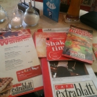 Wir nehmen Platz in der Nähe der Spielecke. Die wird wenig besucht in der Zeit in der wir hier sitzen. Karten liegen schon auf dem Tisch. Essen und Trinken von der Hauptkarte, eine Flammkuchenkarte, Cocktails, Burger und, und, und….