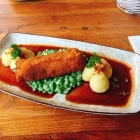 Enttäuschend leider mein Cordon bleu (26,00 Euro). Es hatte fast eine Rollenform und war in der Panade kross ausgebacken worden. Beim Anschnitt dampfte es mächtig und der Deichkäse floss heraus. Der wenige Meersalzschinken war geschmacklich nicht wahrnehmbar. Im Vergleich dazu ist ein Saltimbocca à la Romana eine wunderbare Hochzeit zwischen dem dünnen Schnitzelfleisch und dem Parmaschinken. Die Beilagen wussten zu gefallen. Rahmerbsen und Kartoffelpüree aus dem Spritzbeutel auf einem zurückhaltenden Jus. In dieser Zubereitung würde ich das Cordon bleu als solches nicht wieder ordern. Vielleicht gibt es ja beim nächsten Besuch Oktopus oder Lamm!
