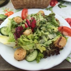 Ich hatte mir den Saisonsalat mit Jakobsmuscheln ausgesucht. Die Jakobsmuscheln waren gut zubereitet. Glasig innen, nussig im Geschmack. Das konnte gefallen. Dazu ein großer frischer Salat mit einer guten Vinaigrette. Gutes Sommergericht für heiße Tage.
