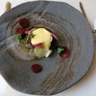 Ein halbes, supercross ausgebackenes Exemplar, begleitet von Mais in verschiedenen Ausformungen, geröstet, karamellisiert, souffliert und genial confiertes Eigelb. Aufgegossen mit einem Erdnussöl-Sud und etwas Schärfe ergab sich für uns eine intensive ‘Lagerfeuer-Aromatik‘, toll.