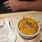 Erstmal Suppe vorn weg. Spotzl entschied sich für die Thai Curry Suppe in der Hoffnung auf schärfe. Das war allerdings gar nicht der Fall. Sie beinhaltete frische Champignons, Bambussprossen und Hühnchenfleisch. Die Suppe schmeckte sehr süß nach Kokosmilch und das rötliche fanden wir irgendwie nach Paprika schmeckend.