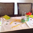 Große Holztische mit einem Tischläufer laden zum Sitzen ein. Die Stühle dazu sind bequem und passen gut zum Gesamtbild. An den weißen Wänden hängen vereinzelt Bilder, teilweise mit Bezug zum Ort Dabringhausen. Auf dem Tisch standen leider künstliche Tulpen, aber eine Blume war immerhin ein „Windrad“. Bunte Glasperlen waren dagegen durchaus hübsch.