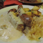 Der Apfelmeerrettich zur Sansibar-Pfeffer-Wurst hätte ruhig etwas mehr Schärfe abkriegen dürfen. Die beiden Würste waren dagegen absolut eigen im Geschmack. Der grüne Pfeffer verlieh ihnen eine ungewöhnlich pikante Note, die sich gut mit den knusprigen Bratkartoffeln und dem Sauerkraut vertrug.