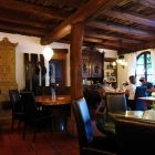 Drinnen erwartet den Gast eine urig-gemütliche Stube, die wie aus einem Bildband über die gastfreundliche Weinregion Pfalz entnommen wirkt. Was anfänglich noch etwas folkloristisch daherkommt, weicht ganz schnell einem Pfälzer Heimat- und Lebensgefühl, das spätestens beim Erreichen der Gaststube aus jedem Eck hervorsticht und dem man sich nur schwer entziehen kann. Rustikales Mauerwerk aus Sandstein, eine Decke, die mit derben Fassdauben verkleidet ist, blanke Wandbänke aus Holz, deren Bequemlichkeit mit ein paar losen Sitzkissen gewahrt bleibt. Der prächtige Kachelofen spendet wohlige Wärme. Neben ihm ist auch der stattliche Wandschrank aus der familiären Erbmasse für die einzigartige Atmosphäre in der „Mathis-Stube“ verantwortlich.