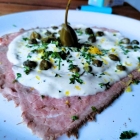 Zum gekochten Jungbullenfleisch mit Thunfischcrème und Kapern-Topping
