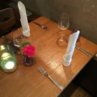 Davor, da drin und dabei aber immer wieder sehr schöne Deko. Nicht trennen wollte man sich augenscheinlich von den alten Tischen und Stühlen aus den Kneipenzeiten, die in ihrem dunklen Holz-Charme dazu beitrugen, dass der Gastraum irgendwie so wirkte, als sei man mitten in der Renovierung stehen geblieben. Aber vielleicht ist das ja auch ein kontinuierlicher Prozess, dass müsste man über die Jahre mit verfolgen. Aber genug der Ambiente-Diskussion, wir brauchten einen Tisch zum Essen.