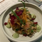 Das war dann mal eine Matjes-Kombination, auf die ich nicht gekommen wäre. Und eine äußerst schmackhafte dazu. Ich orderte an dem Abend vorweg Lachstatar & Kapernäpfel / Frischkäse-Basilikum-Dip / Gemüsechips / Queller