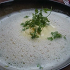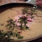 Das selbstgebackene Brot mit dem citrus-frischen Aufstrich (eine Art Limetten-Creme) rettete mich vor dem drohenden Hungertod. Das entspannte die Wartezeit auf das Essen und beruhigte den inneren Wolf. Der Beilagensalat meiner Begleitung und meine Suppe kamen gleichzeitig. Knefler’s schaumig geschlagener „Orient-Express“ rauschte in seiner dekorativen ovalen Schale bis an seinen vorherbestimmten Endbahnhof, der sich direkt unter meiner Nase befand. Allein der Geruch nach Kreuzkümmel und Koriander versetzte mich kulinarisch in den Nahen Osten. Das war keine sämige Kürbismousse, sondern von der Konsistenz her eher eine Brühe. Aber der Geschmack zählt ja bekanntlich und der war einfach himmlisch orientalisch. Geröstete Kürbiskerne erinnerten die Geschmackspapillen an den Namensgeber dieser feinen Schaumsuppe, die u.a. vom aromatischen Galgant ihre pikante Würze erhielt und wunderbar abgeschmeckt war. Ein saisonaler Gruß aus dem Morgenland, den ich in vollen Zügen genoss.