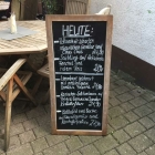 Wir wurden in Empfang genommen mit den Worten "sie sind die Herrschaften, die Frau Minges angekündigt hat?", da konnten wir nur nicken und die Frage nach einem Tisch draußen bejahen, es war ein schöner Frühlingstag mit blühenden Mandelbäumen in der Pfalz. Wir nahmen Platz und das Tagesangebot wurde uns neben den Tisch gestellt.