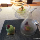 Uns erwartet jetzt nämlich die kulinarische Einstimmung: Reh, Knäckebrot, Bete, Aprikose, Rucola, Sellerie, Himbeere, Reistee, Räucheraal, Eierstich, Sojabohne, Wasabi. All diese Köstlichkeiten sind in zwei Gläser und auf einer Schieferplatte verteilt. Der Reistee wird angegossen. Jede einzelne Komponente der Zutaten ist exzellent herausgearbeitet und bietet dem Gaumen einen vielversprechenden Eindruck von dem außergewöhnlichem Können der Küche.