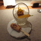 Für andere mag Fisch und Fleisch das Highlight eines Menüs sein, meine Stunde schlägt jetzt. Auf dem Kärtchen vor mir steht nun Pre Dessert: Holunder, Karamell, Karotte. In einem bauchigen Glas bettet sich auf einem Granité aus Holunder (der mit einem Schlückchen Champagner angegossen wird) ein kleines Küchlein mit frittierten Karotten und davor liegt auf den ersten Blick völlig harmlos ein Karamelleis-Lolli, der mich als Dessert-Junkie in den siebten Himmel katapultiert.