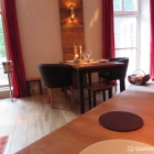 Das Feinschmeckerlokal liegt zwar im Untergeschoß, hat aber dennoch Fenster und eine Tür ins Freie, allerdings keine Terrasse. Anhand des Fotos, das ich vom Nebentisch gemacht habe, kann sich jeder selbst einen Eindruck von diesem wohltuend schlicht eingerichtetem Raum verschaffen, der durch die goldenen Lampen eine besonders schöne Beleuchtung erfährt.