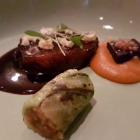 Ziegenkäseravioli/ Kürbis süß-sauer/ Walnüsse für meine Frau. Ich habe genascht und war sehr angetan, optisch und geschmacklich überzeugend.