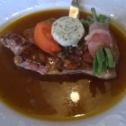 Für mich sollte es heute mal wieder Rumpsteak sein. 18,80 Euro wurden hierfür aufgerufen. Grüne Pfefferkörner auf dem Steak und in der super schmackhaften Soße, die ich dann zum Schluss noch mit einem Suppenlöffel auslöffelte. Obendrauf eine Scheibe Kräuterbutter sowie ein paar grüne Bohnen mit Speck ummantelt. Medium bestellt, nicht hundert Prozent medium bekommen, aber superzartes Fleisch mit leichtem Fettrand außenherum, toller Geschmack, gute Fleischqualität.