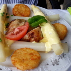Ihre Schwester war auch sehr zufrieden mit der zarten Hähnchenbrust mit Spargel (14,80 €) und Rösttaler, die nach TK aussahen, aber trotzdem gut dazu passten.