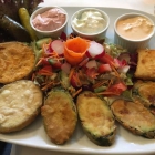 In der Speisekarte finden sich überwiegend typische griechische Gerichte. Wir entdecken sofort für uns die gegrillten Peperoni (4,00€). Von der Stückzahl reichlich fehlten jedoch die Röstarmonen komplett, es waren keine Grillstreifen zu erkennen. Schade, denn der gute Knobigeschmack konnte dafür nicht entschädigen. Anschließend bestellten wir die Mesesplatte (8,50€). Die Platte war belegt mit gebackenen, melierten Auberginen, zwei gefüllten Weinbeerblättern etc. Die Auswahl war recht begrenzt, lecker schmeckten jedoch die drei Dips dazu. Was ausgezeichnet war, war der Steakteller mit Pommes ( 6,50€). Butterzart ausgebacken und ansprechend gewürzt.