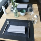 In der Mitte der Tische hellt ein schmales weißes Band mit hellem, floralem Druck als Tischdeckenersatz das dunkle Mobiliar angenehm auf. Darauf die üblichen Utensilien: Glaswindlicht, Glasblumenvase mit frischen Blumen, Wasserglas, Weinglas und am Tischrand Messer, Gabel und eine graue Papierserviette der hochwertigeren Art. Nett und einladend!