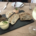 Das Hausbrot wurde auf einer viereckigen Schiefertafel mit 2 verschiedenen Brotsorten und 2 Gläsern mit Dips serviert. Das Brot rösch, frisch, die Dips ebenfalls angenehm im Geschmack, ein Dip hatte einen deutlichen Nußgeschmack, der andere Dip mit Paprika-chili-Geschmack, vermutlich beide eine Frischkäsemischung, was sie allerdings enthielten, konnten wir trotz Nachfrage nicht ausfindig machen, wir erhielten keine Auskunft bis zum Verlassen des Restaurants.