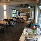 Ein modern gestalteter Eingangsbereich empfängt den eintretenden Gast und fast bodentiefe lange Glasflächen geben sofort den Blick auf das früher mal mit Wasser gefüllte Schwimmbecken und die großzügige Terrasse frei. Feines Stäbchenparkett in hellen und dunklen Brauntönen dämpfen die Schritte. Der Raum ist mit quadratisch dunkelbraunen Holztischen und moderne, hell gepolsterte Stahlstühle mit schmalen Rücklehnen eingerichtet.