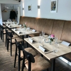 Umgestaltet bzw. mit neuem Mobiliar usw. wurde der Restaurantbereich ausgestattet. Holztische mit rohen aber gehobelten Eichenplatten, in Vierer- und in Zweiertischen aufgeteilt , dunkle Stühle mit hellbraunen Polstern und angenehmen Rückenlehnen, Sessel in verschiedenen Farben mit Stoff bezogen, allesamt sehr gemütlich. Die Tische mit grauen festen Papierservietten, Edelstahlbesteck, eine Vase mit frischen Blumen, ein großes Teelicht in einem viereckigen Glasbehälter eingedeckt. An der Rückwand im vorderen Restaurantbereich eine großzügige sandfarbene Sitzbank mit hoher Lehne. Alles sehr stimmig. Die Wände mit Farbfotografien, die zum Ambiente dieses ehemaligen Schwimmbads passen, behängt.