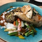 Die beiden Hähnchenbrüste waren innen saftig und hatten außen eine leichte Bräunung. Das Gemüse aus Broccoli, Paprika, Zuckerschoten und roten Zwiebeln war frisch und knackig in der Konsistenz. Ein Kokos-Schaum umhüllte das Gemüse. Drei kleine Zucchini-Feta-Puffer waren eine geschmacklich abgerundete, interessante und gut schmeckende Beilage, meinte meine Begleitung. Angenehm war der Duft nach asiatischen Aromen.