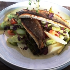 Ich wählte als Vorspeise eine Bouillabaisse mit Meeresfrüchten, Aioli und Fenchel (7,50 €). In einem weißen runden Teller mit breiter Fahne lag die Bouillabaisse, gefüllt mit Kabeljau, einer Rotgarnele, Venusmuscheln und am Rand drapiert, kleine Tupfer von Aioli und knusprig gebratenem Fenchel. Die Bouillabaisse aufgeschäumt, als Basis eine wohlschmeckende Bisque, vermischt mit einer herzhaften Brühe, die Meerestiere und der Fisch knackig und glasig, so wie ich es mag. Noch im Gaumen klang der Wohlgeschmack dieser Suppe nach. Ich war begeistert.
