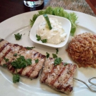 Ein Spieß mit weichem, eingelegten und gegrilltem Fleisch. Sehr gute Würzung, so, wie man es eben erwartet. Als Beilage ein Tomatenreis, welcher auch den Namen verdient hat. Keine labberige Angelegenheit, bei der man sich fragt, ob der Koch den falschen Beruf ausübt. Geschmack, Biss, auch optisch schön anzuschauen. Warum geht hier, was in vielen anderen "Griechen" nicht machbar ist? Danke dafür, dass meine lange Abstinenz an griechischen Lokal so gut beendet wurde. Auch der Tzatzik (die Schreibweise darf sich jeder gerne selbst heraussuchen...) war keine Eimerware, die einem echten Griechen die Tränen in die Augen treiben würde. Knoblauch, Gurkenstückchen, von einem Könner gewürzt. Hervorragend.
