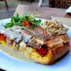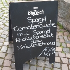 Und nicht besser geht die nach angenehmer Wartezeit warm servierte Quiche, so locker und saftig die gestockte Ei-Mischung! Durch Tomatenstücke noch etwas feucht, ohne auseinander zu fallen. Die Haube war schön gebräunt, und der Teig sorgfältig ausgerollte noch leicht knusprig, famos! Auch der weiße Spargel schmeckte durch und war noch etwas bissfest. Die zusätzliche Kräutersauce hätte es gar nicht gebraucht, aber sie war auch beleibe nicht geschmacklos.