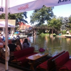 Mein Blick fiel auf den Außenbereich vom Restaurant Flaggschiff, die Gasträume befinden sich im ersten Stock über den Büros der Kahnbetriebe. Der durch große und stabile Sonnenschirme geschützte Außenbereich befindet sich direkt an der Wasserkante.