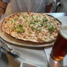 Gegenüber dann ein klassischer Elsässer Flammkuchen für 14,50 Euro. Beeindruckend das Ausmaß und geschmeckt hat es auch. Ich gönnte mir das Lammgericht für 34 Euro. Vom Lamm zwei rosa gebratene Tranchen vom Rücken und eine Lammbratwurst. Das Muskelfleisch perfekt und die Wurst mit einem überraschendem, intensiven Lammgeschmack. Dazu auf dem Teller Bohnen-Cassoulette, Bohnencreme, Tomatenkaramell. Extra eine heiße Ofenkartoffel mit Ziegenfrischkäse. Alles durchgehend schmackhaft und auch für den guten Appetit ausreichend portioniert.