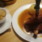Ich hatte mich für die deftige, bayrische Variante zum Mittag entschieden, und so sollte es für mich der Schweinebraten in dunkler Dampfbiersoße mit Knödel und Krautsalat sein. Als Schweinebraten gab es eine dicke Scheibe Schweinekamm und eine ebenfalls starke Scheibe Schweinebauch.