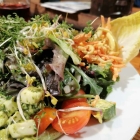 Mein traditionelles Pfälzer Weinstubengericht konnte mich ebenfalls überzeugen. Der Saumagen kam schön würzig und mit erkennbaren Stücken von Fleisch und Kartoffeln daher, der Leberknödel ebenfalls gut gewürzt und fluffig ( nicht zu vergleichen mit den knochenharten Dosenknödeln die einem manchmal auf Skihütten serviert werden ) und auch die Bratwurst zeigte sich wie die anderen Produkte von einer Machart, welche die Herkunft vom Metzger und nicht vom Discounter verrät. Dazu wurde ein gut abgeschmecktes Sauerkraut serviert welches definitiv nicht nur die Zutaten Dose – Dosenöffner – Topf gesehen hatte. Da den Bewohnern der deutschen Toskana eine gewisse Affinität zu Soßen nachgesagt wird durfte eine gute Portion dunkler Bratensoße natürlich nicht fehlen, ob diese nun selbstgemacht war möchte ich nicht beurteilen, geschmeckt hat sie allemal. Die dazu dazu gereichten drei Scheiben Bauernbrot waren frisch. Für uns deshalb für die beiden Hauptgerichte ebenfalls 4****.