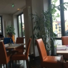 Es gibt hier eine lange Front mit Tischen , einer Bank und Stühlen in oranger Lederoptik, die allerdings etwas eng gestellt sind. Gegenüber stehen für zwei Personen einzelne Tische.